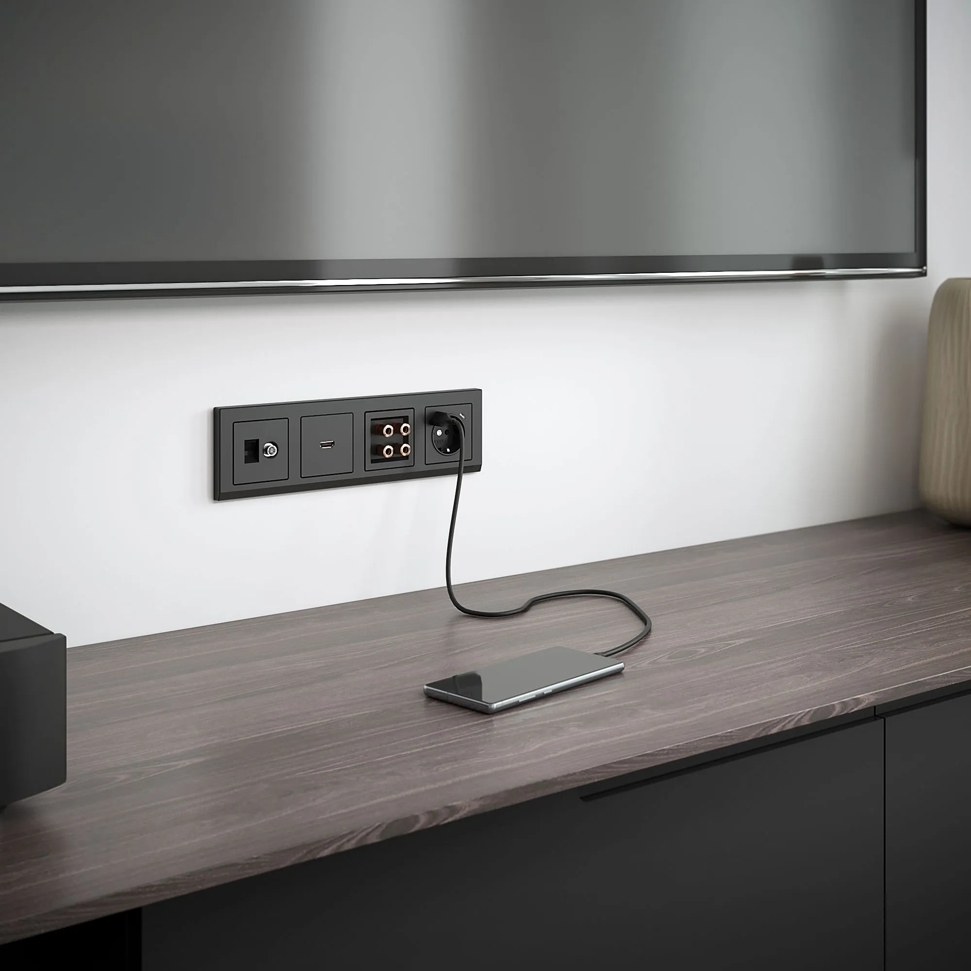 • После монтажа остаются видны только аккуратная панель и декоративная рамка, что делает розетку практически незаметной на стене